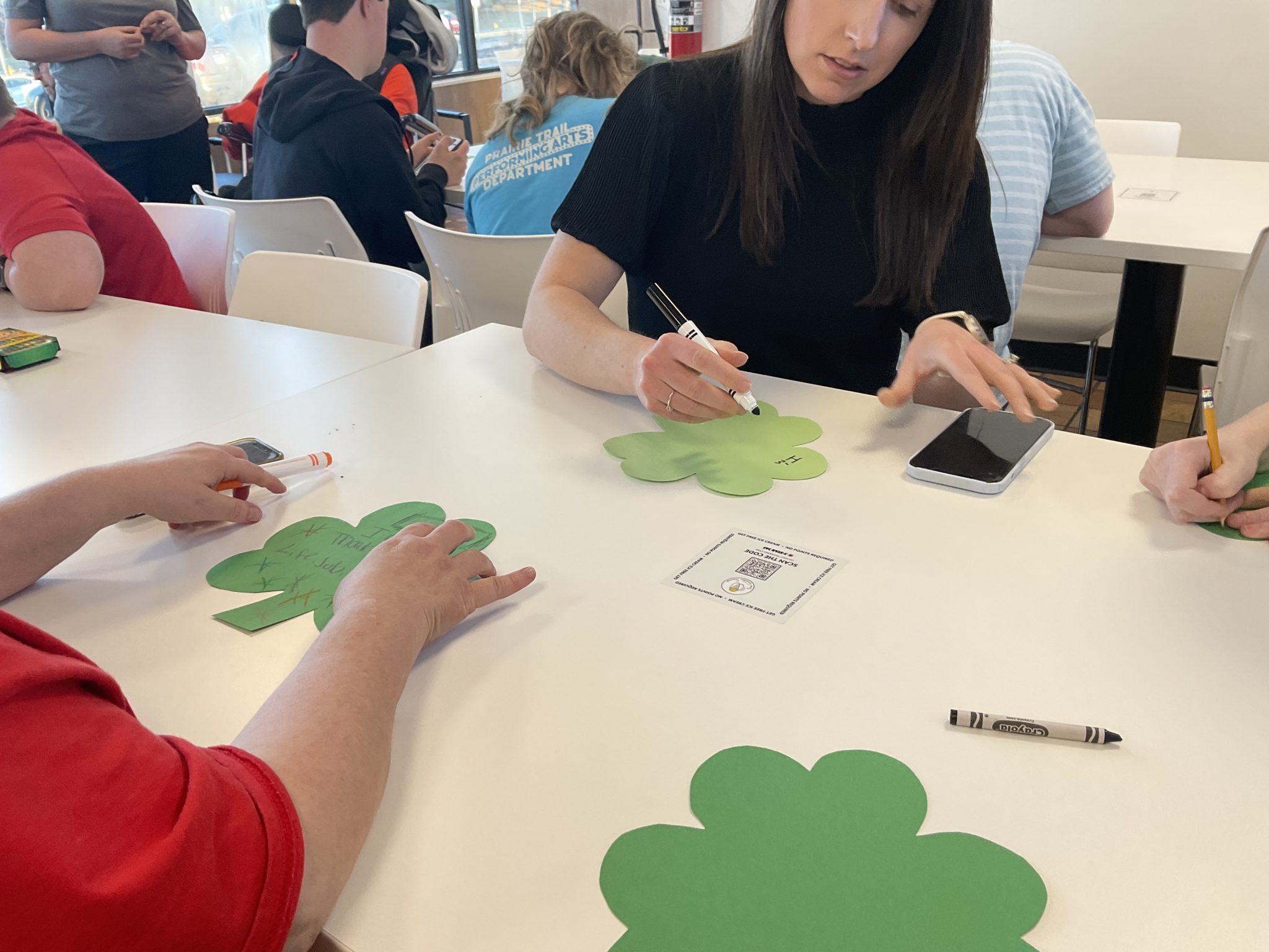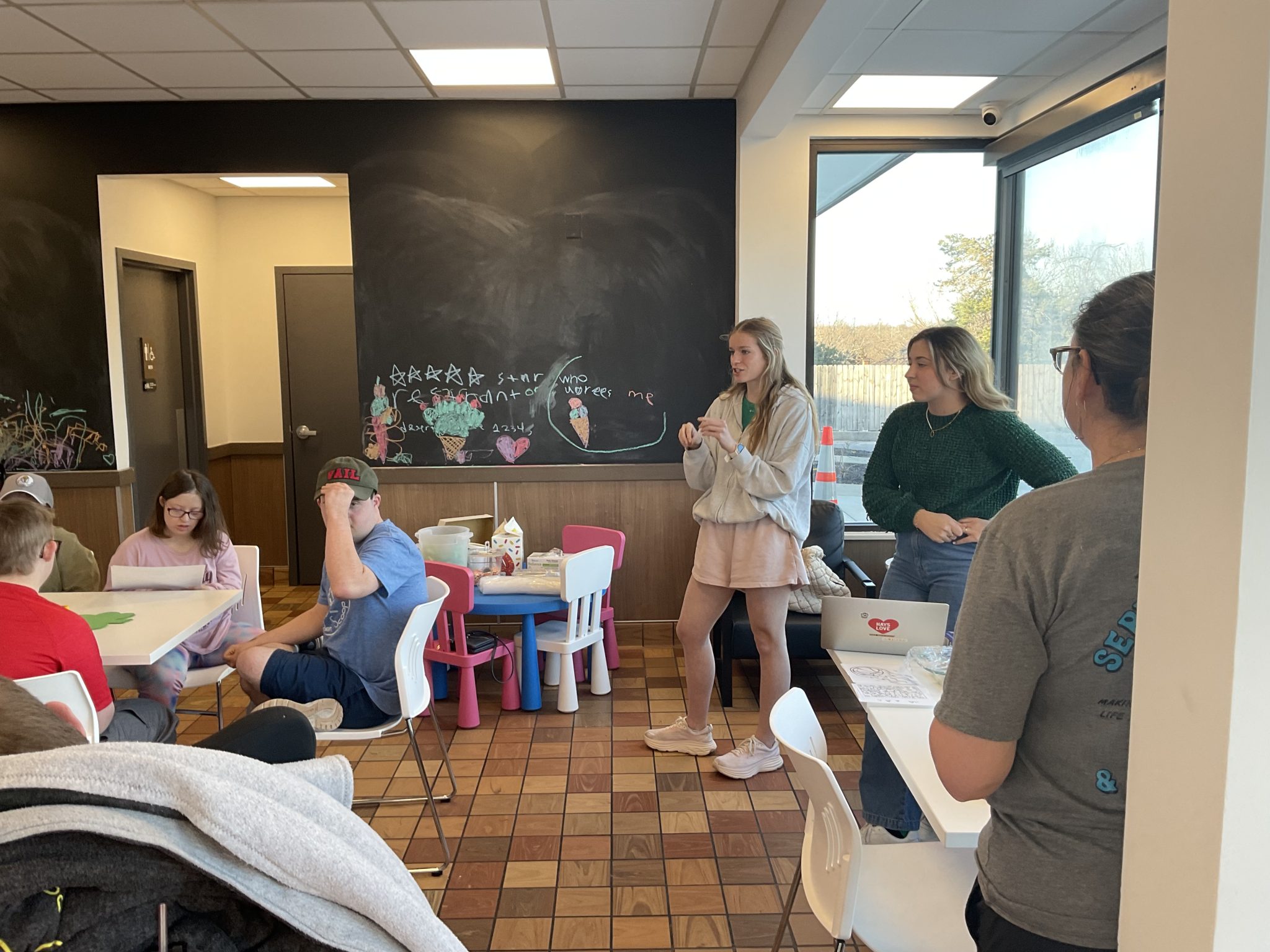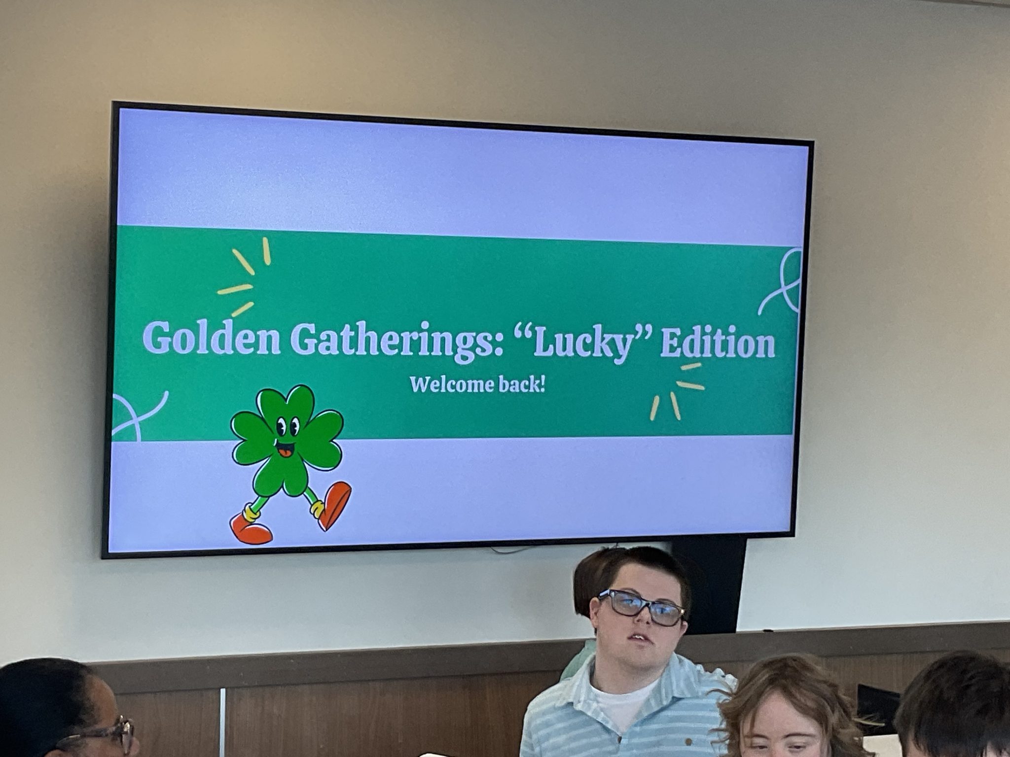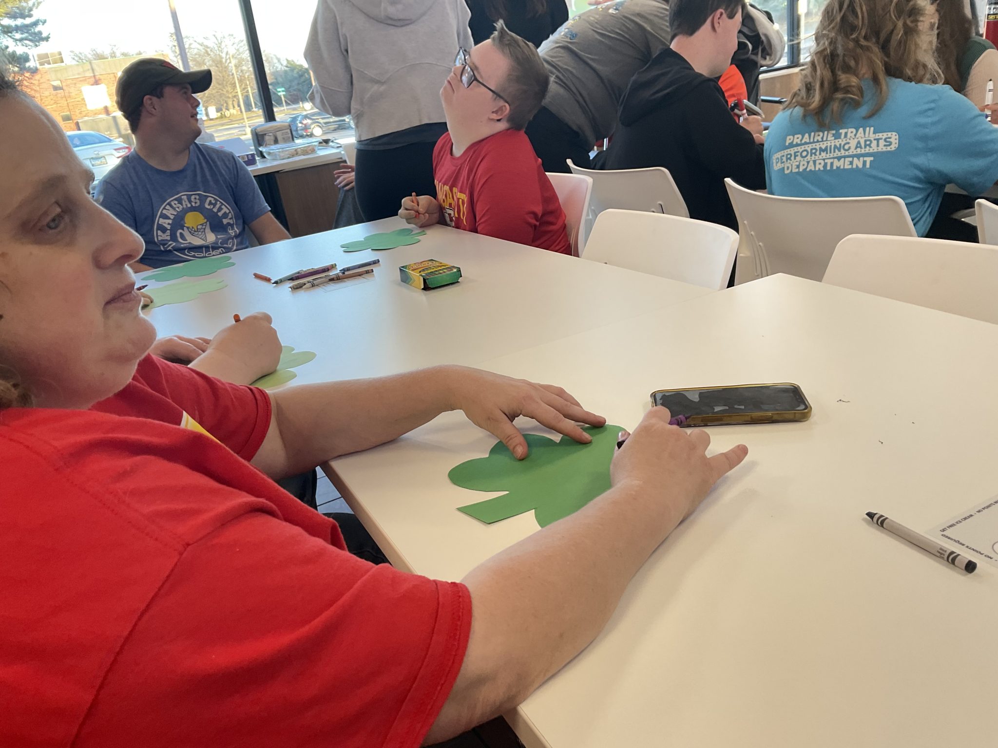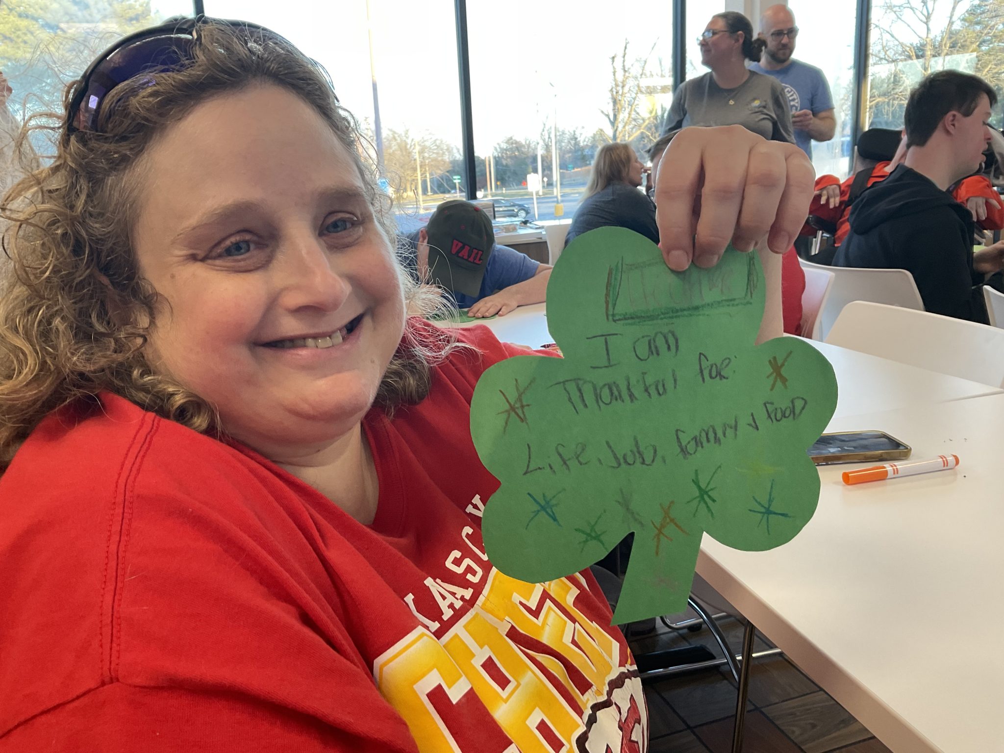 Super Scoopers gathered at The Golden Scoop on 103rd and 69 Highway to create four-leaf clovers bearing a list of what they were grateful for. The event was hosted by our wonderful OT students again, and they put together another fabulous presentation on the importance of being grateful for all the things we are lucky to have, like family, friends, coworkers, and fun times! Afterwards, they got to hang them up (at both locations!), so if you drop by this month at either café, you can see their lucky clovers for yourself!