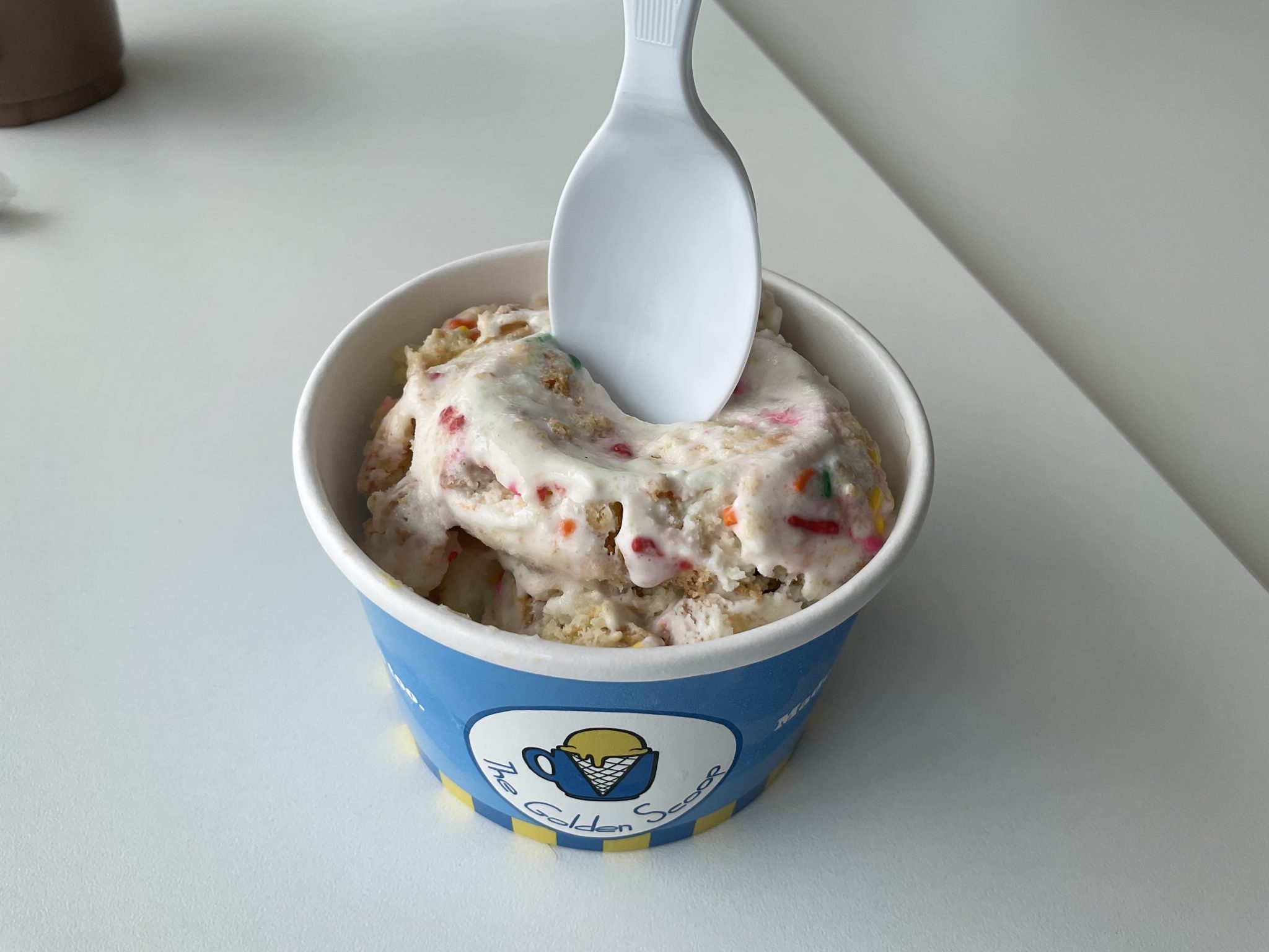 Sunday, April 14th, was our FOURTH anniversary! Do you like cake on your birthday? We do, too! For our fourth anniversary, we created a special birthday cake ice cream, with vanilla ice cream mixed with cake pieces, sprinkles, and frosting!